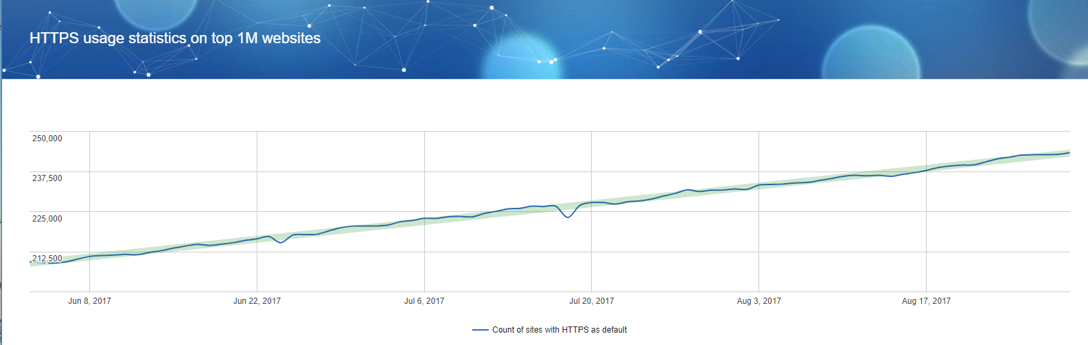 As of June 2017, 21.7% of Alexa top 1,000,000 websites use HTTPS as default, 43.1% of the Internet’s 141,387 most popular websites have a secure implementation of HTTPS, and 45% of pages use HTTPS. These numbers will only continue to grow as the threat of cybersecurity increases and large internet-related companies, like Google, work to mitigate this issue.